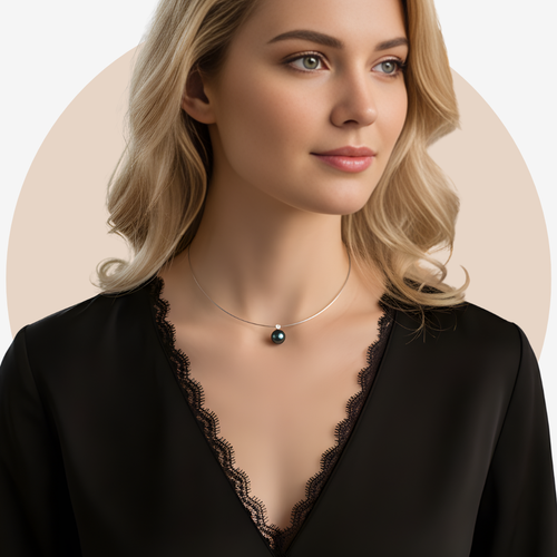 Tahiti-Perlen Omega Halskette (8–9 mm) – 925 Sterling Silber, weiß rhodiniert | „Schwebende Perle“, Farbe Pfau | 42/45 cm