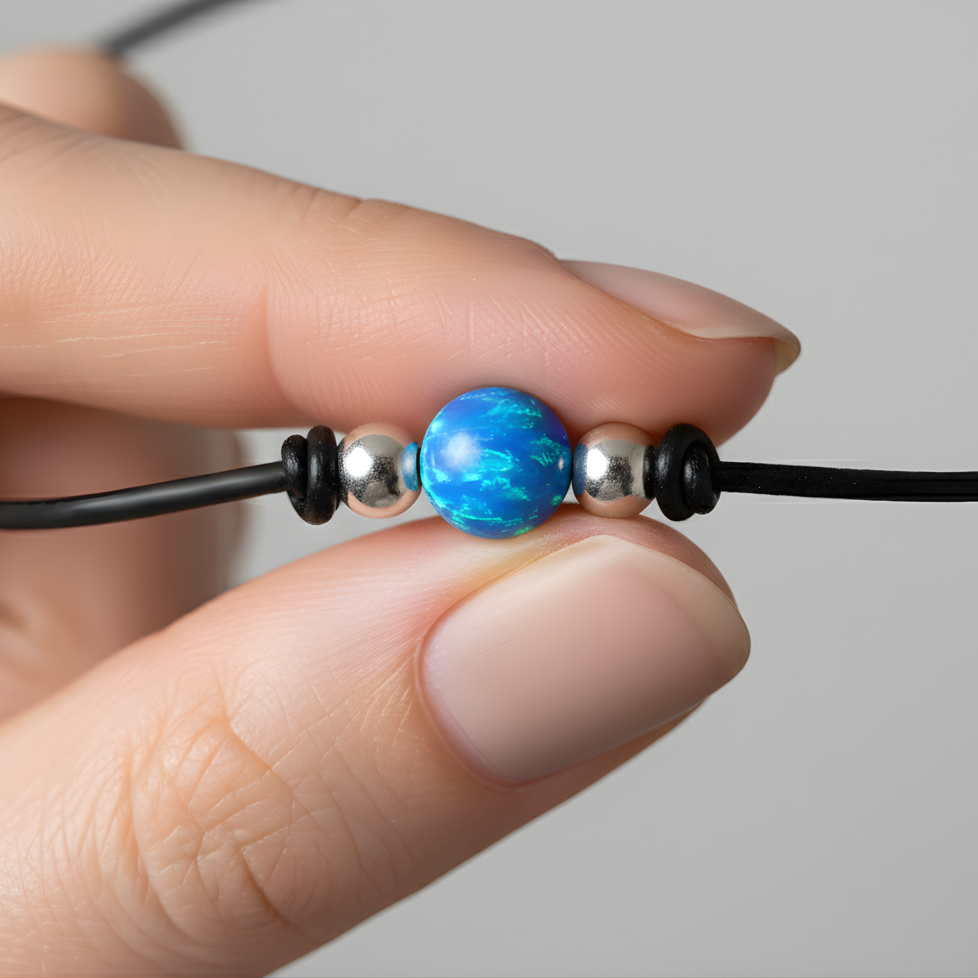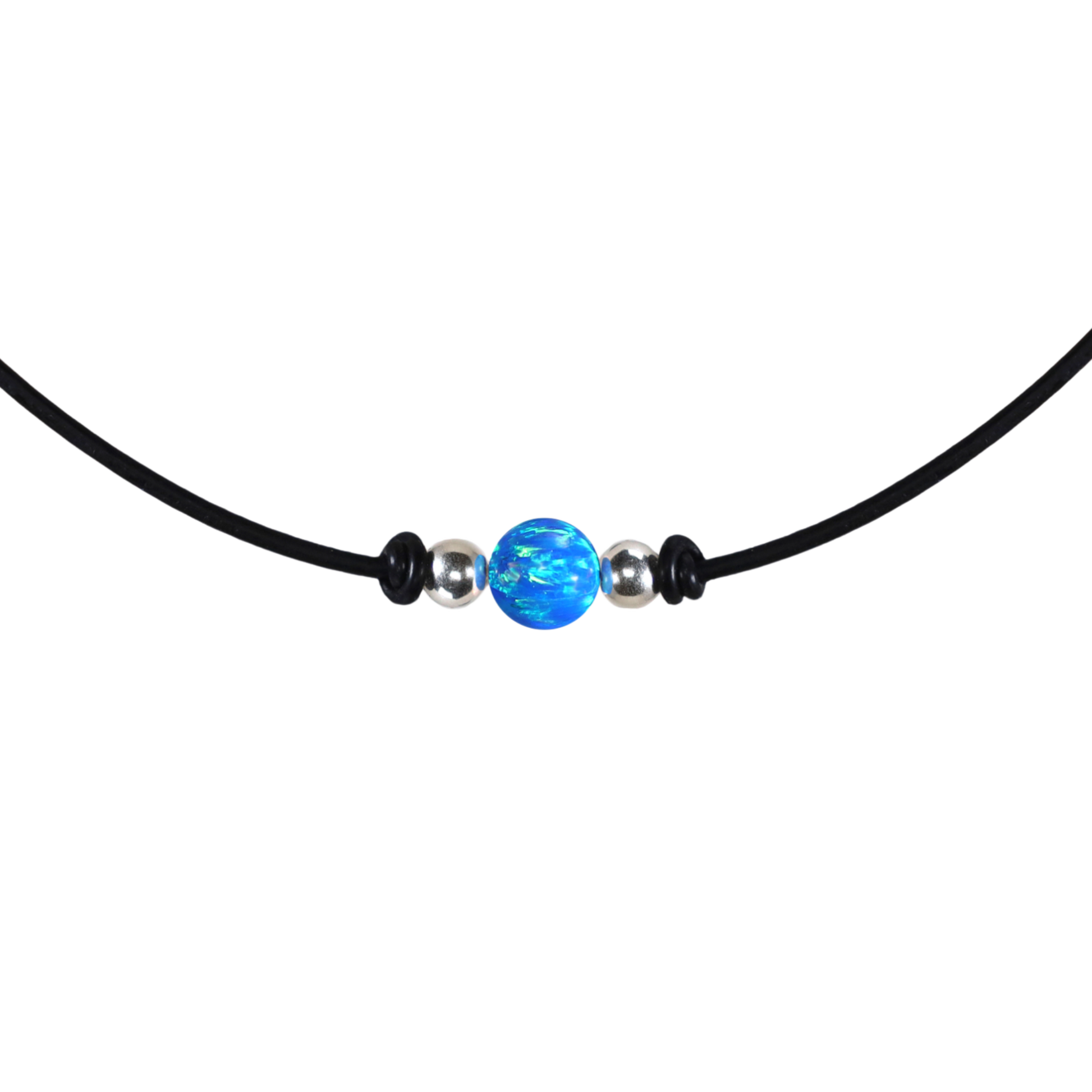 Blauer Opal Halskette – 8 mm Rundanhänger mit 925 Sterling Silber & Echtlederband | Handgefertigter Choker für Damen