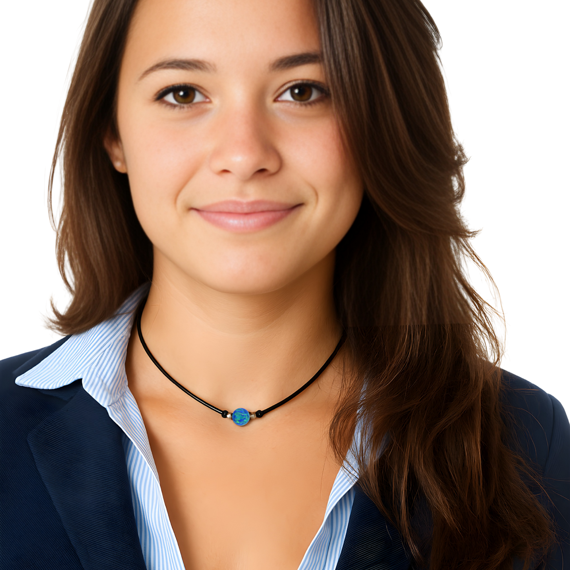 ❖ Einzigartiger Stil trifft auf Handarbeit – Diese elegante Halskette kombiniert tiefblauen synthetischen Opal mit glänzenden 925 Sterling Silber Kugeln auf einem feinen schwarzen Ziegenlederband (1,5 mm). Der 8 mm Opal schimmert in faszinierenden Nuancen von Blau und Grün – ein echter Blickfang für jeden Anlass.