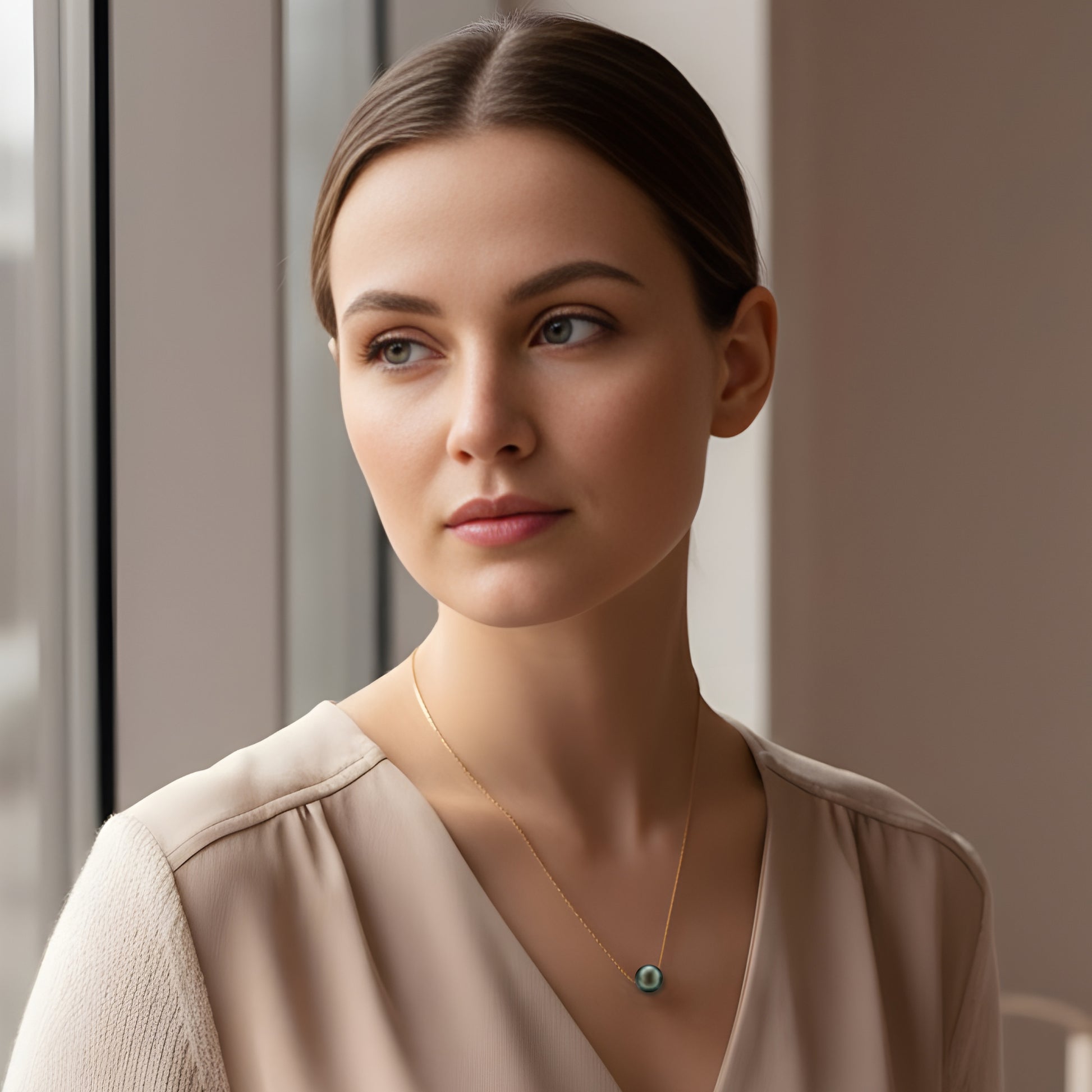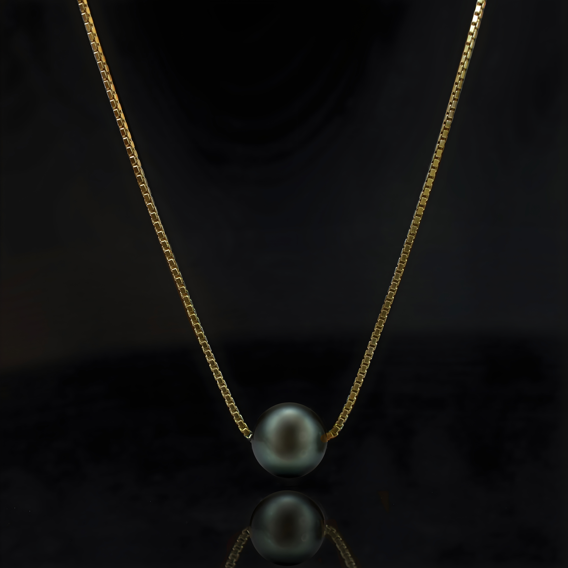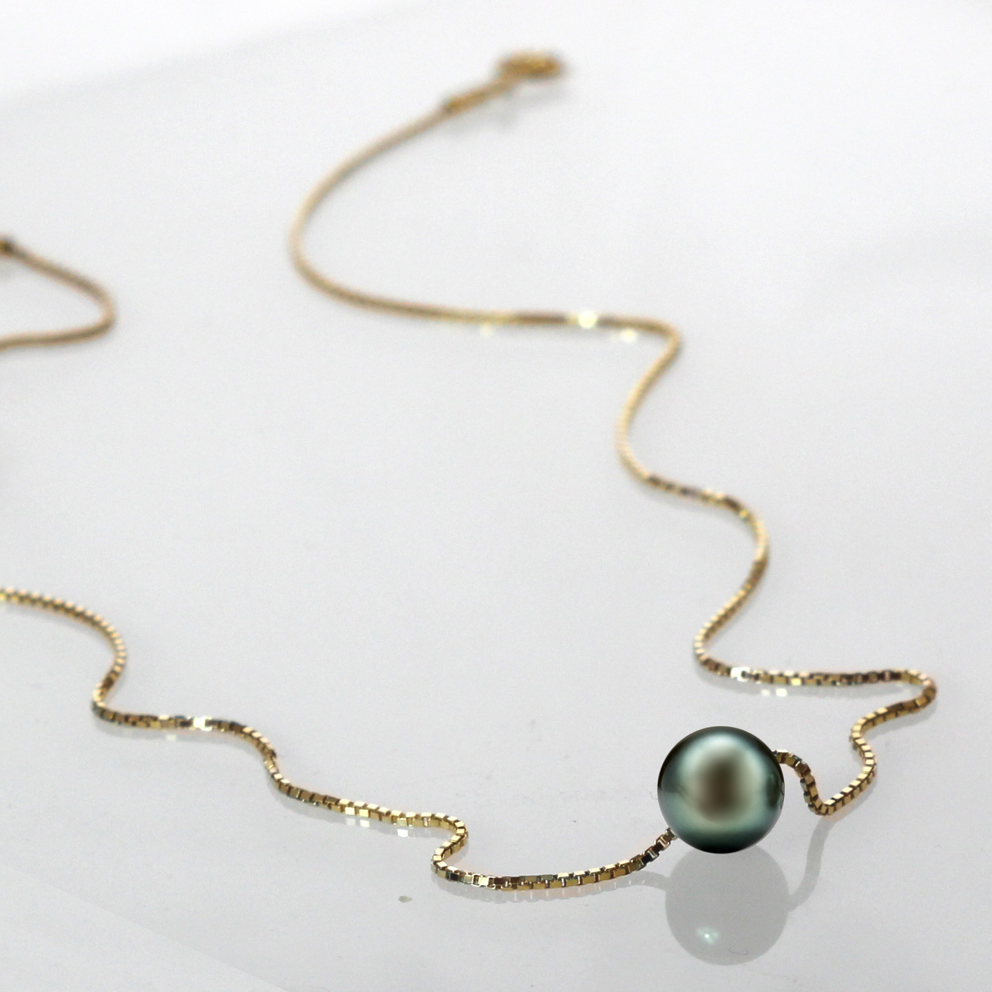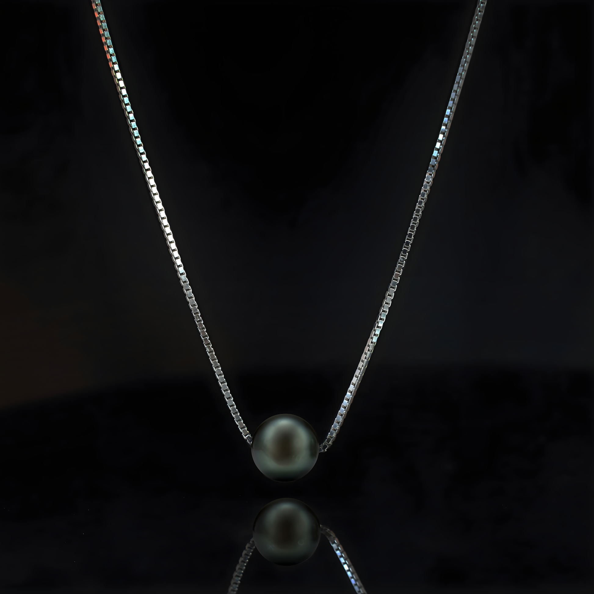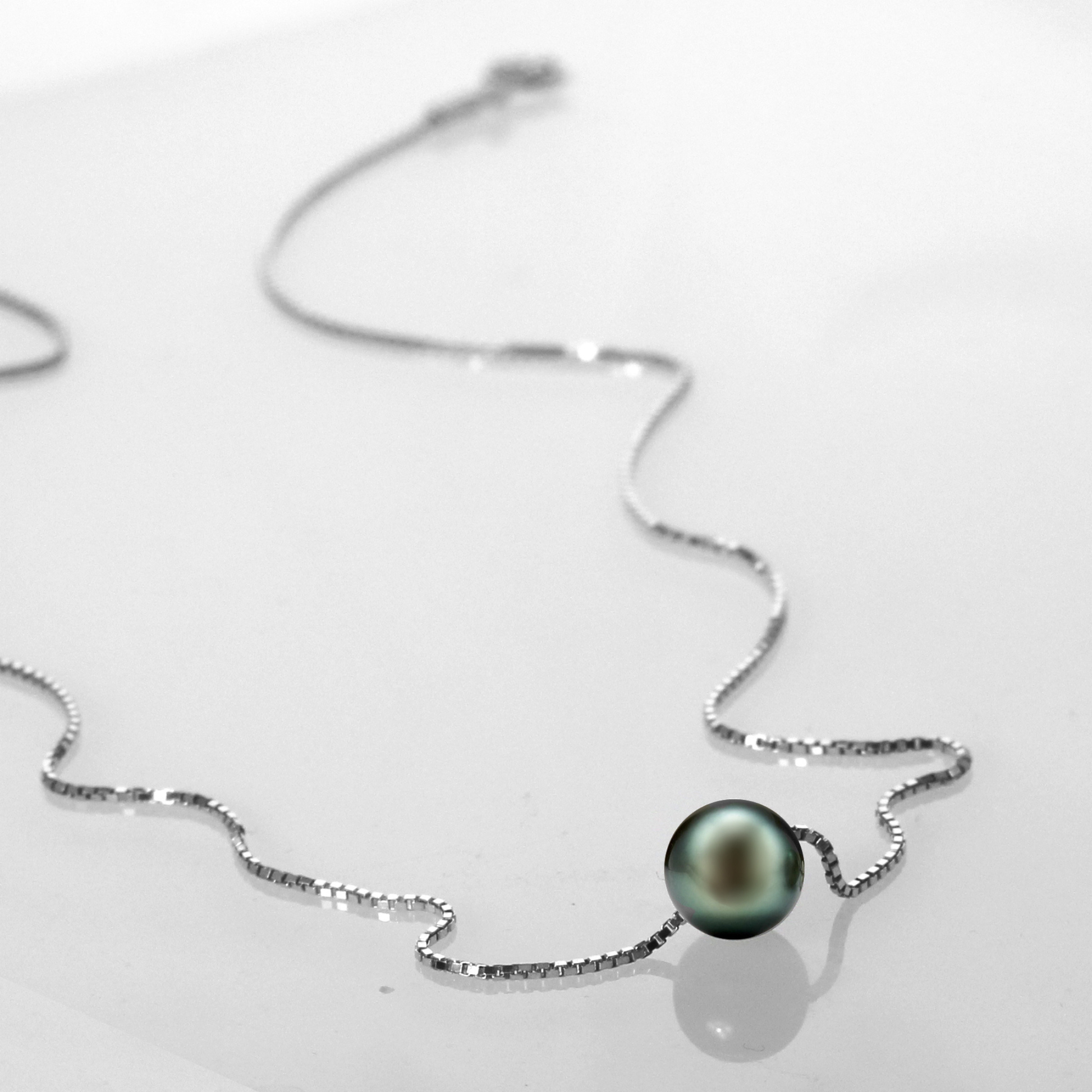 Diese edle Halskette verkörpert pure Eleganz: eine echte, runde Tahiti-Zuchtperle (AA+ Qualität, Ø 9–10 mm) auf einer feinen Venezianer-Boxkette aus weiß rhodiniertem 925 Sterling Silber oder wahlweise 14 K vergoldetem Silber. Jede Perle wird von erfahrenen Juwelieren handverlesen und besitzt einen außergewöhnlichen Glanz, eine glatte Oberfläche und perfekte Form.