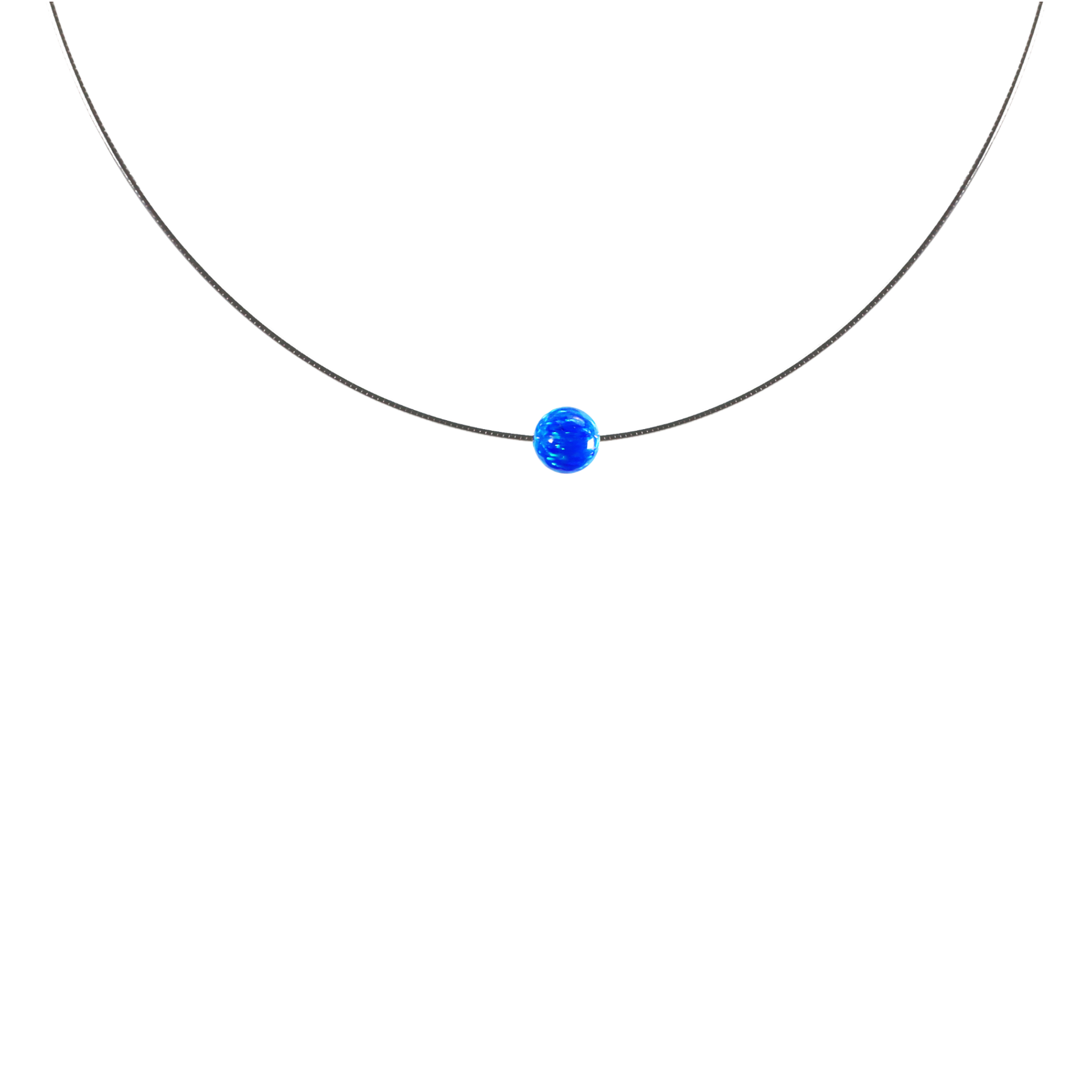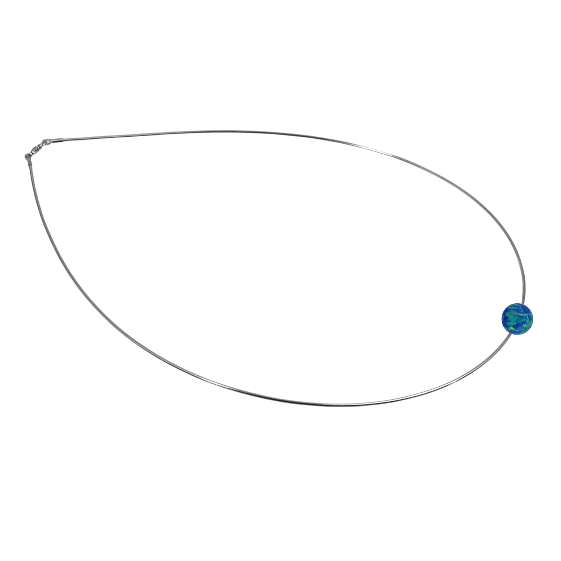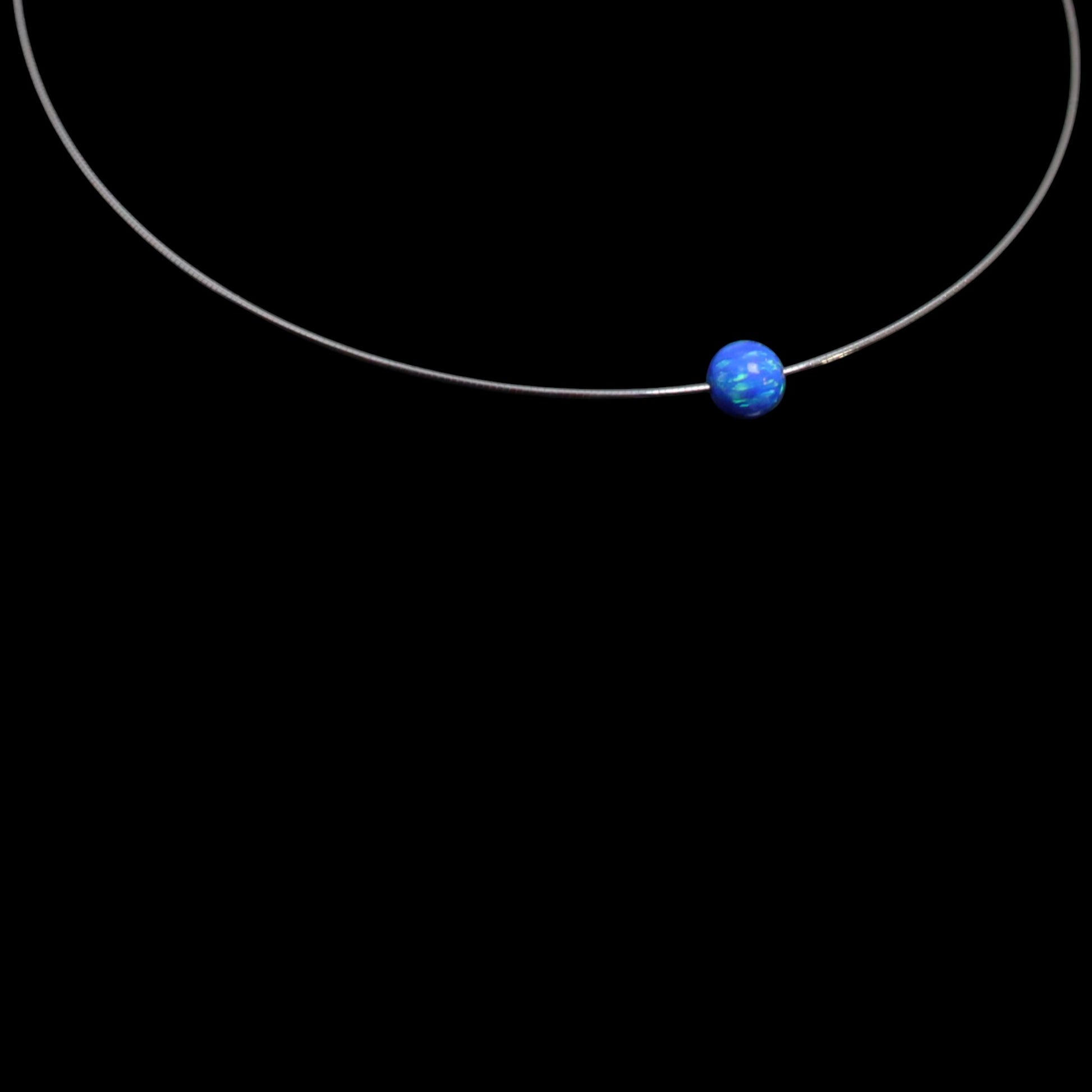 Dieses elegante Collier vereint zeitlose Klarheit und modernes Design. In der Mitte des feinen Reifs aus weiß rhodiniertem 925 Sterling Silber schwebt ein schimmernder Blauer Opal (8 mm, AAA-Qualität), der bei jeder Bewegung faszinierend leuchtet.