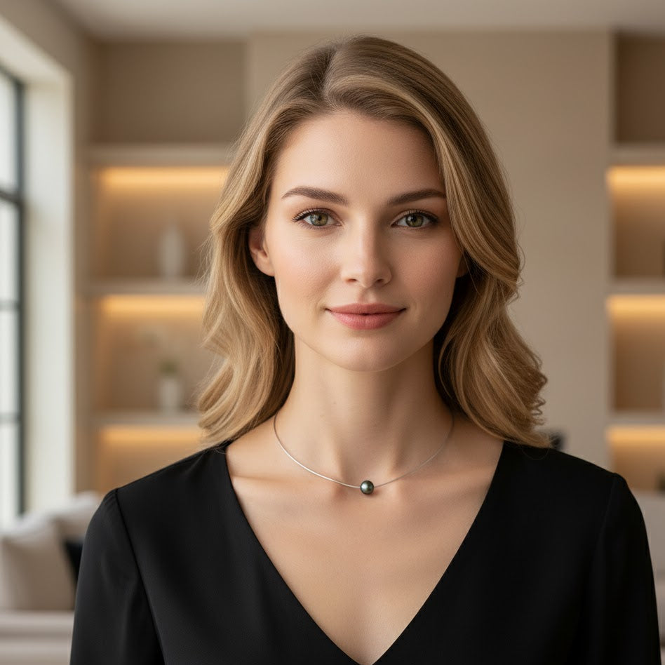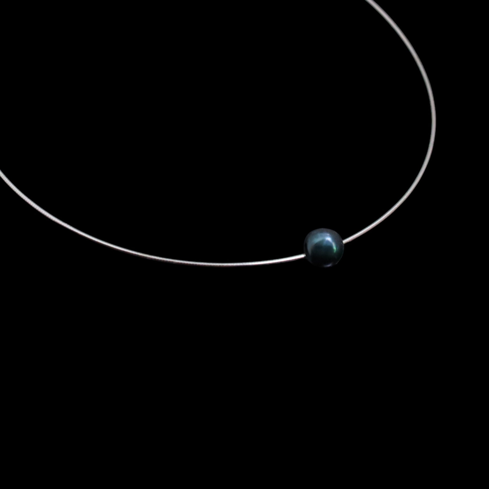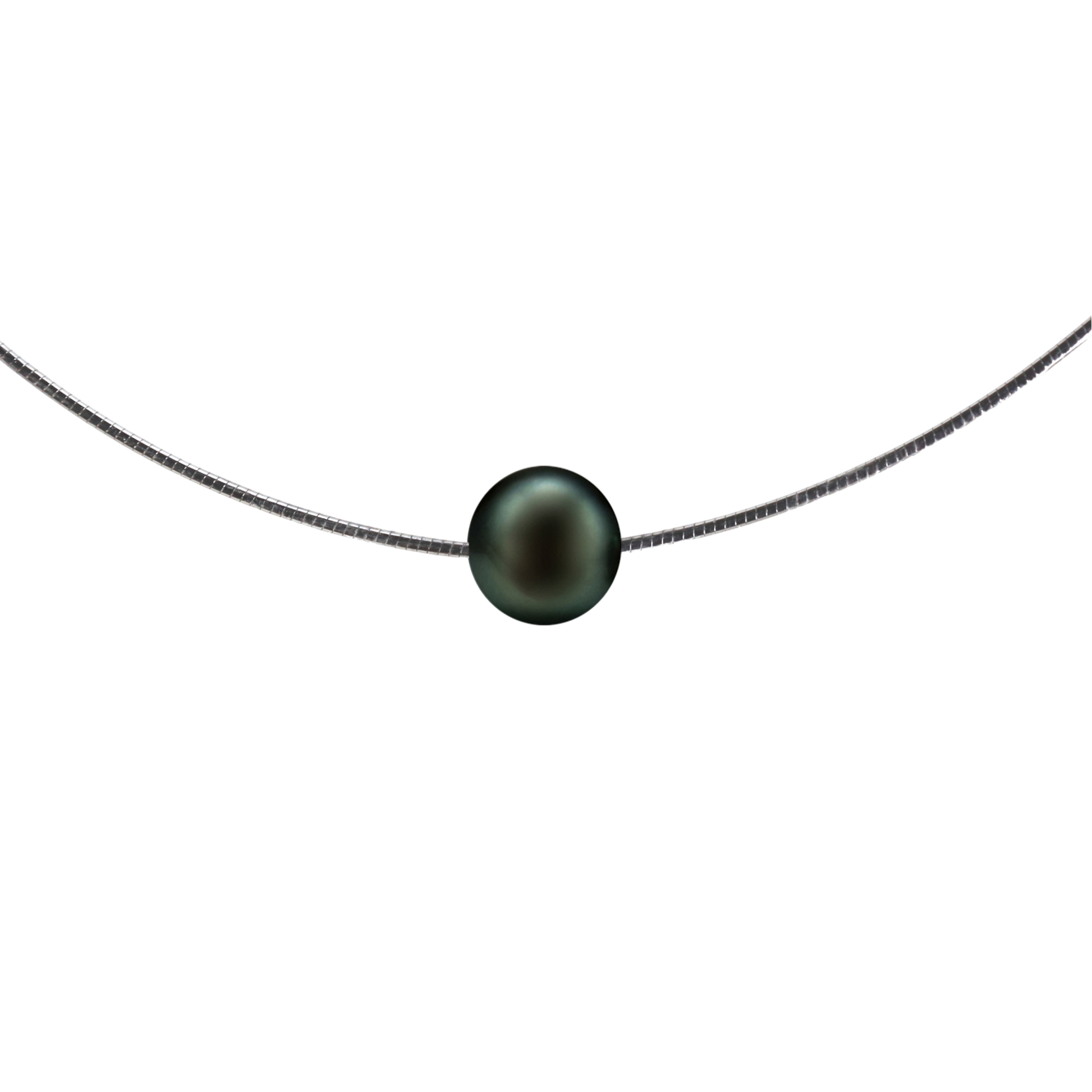 Tahiti-Perlen Omega Halskette (8–9 mm) – 925 Sterling Silber, weiß rhodiniert | „Schwebende Perle“, Farbe Pfau | 42/45 cm